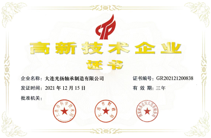 大連光揚軸承制造有限公司順利通過“高新技術企業”復審認定,并收到了大連市科學技術局、大連市財政局、國家稅務總局大連市稅務局聯合頒發的《高新技術企業證書》。 高新技術企業是國家為鼓勵高新技術企業發展,調整產業結構和提升國家經濟競爭力而設立的專項資質認定,具有極高的含金量。 此次通過高新技術企業復審認定,既是對光揚軸承近年來發展的認可,也是對公司科研創新能力和技術實力的充分肯定。